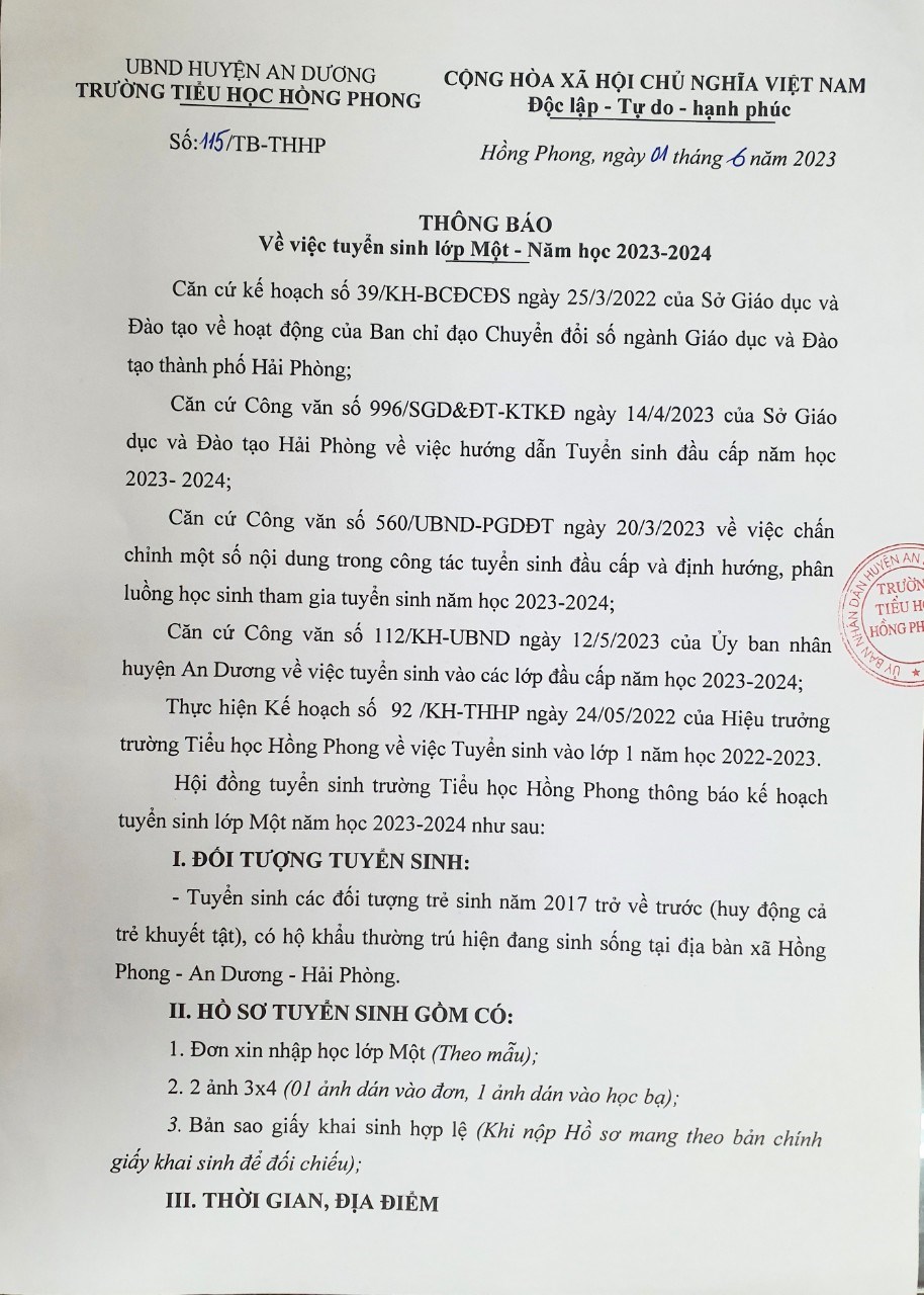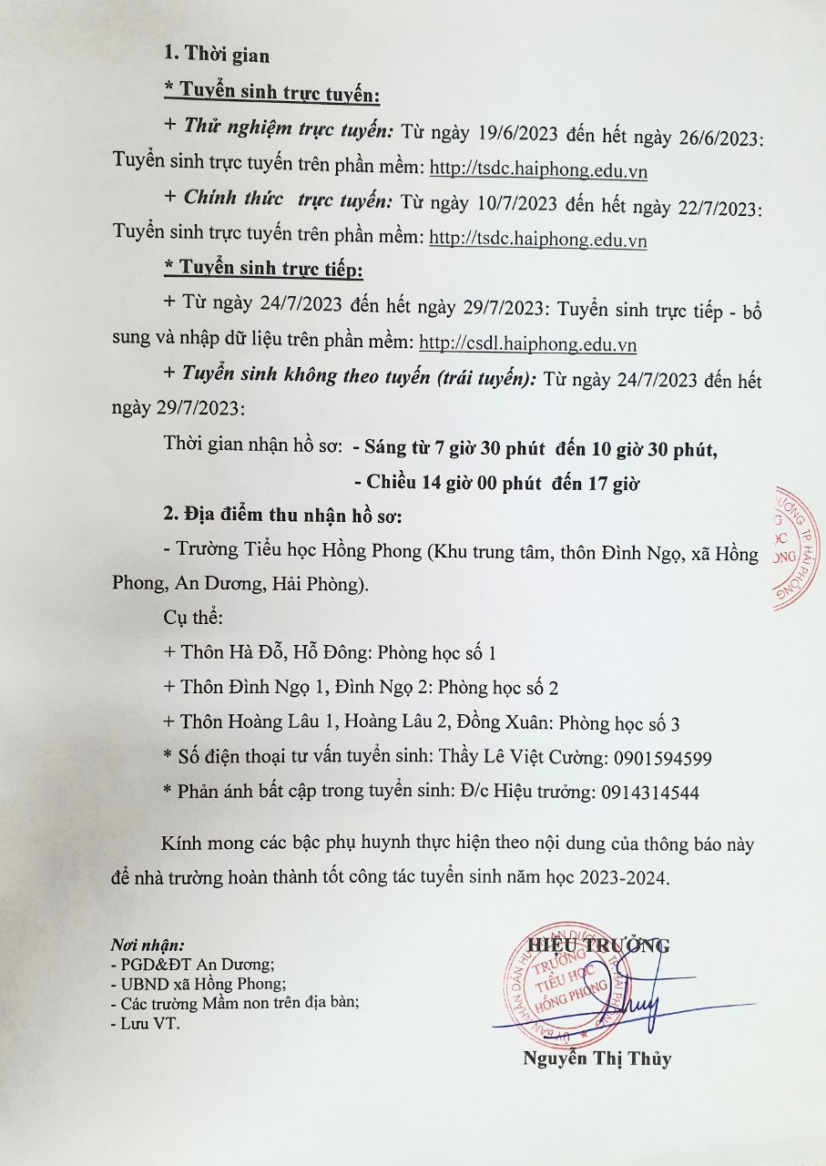 Trường Tiểu học Hồng Phong thông báo hướng dẫn tuyển sinh Lớp 1 năm học 2023 - 2024: để giúp các bậc phụ huynh có con em chuẩn bị bước vào lớp 1 năm học 2023 - 2024 đăng kí tuyển sinh được dễ dàng, chính xác, thuận tiện và hiệu quả nhà trường đã triển khai 2 hình thức tuyển sinh trực tiếp và tuyển sinh trực tuyến giúp các bậc phụ huynh đang kí tuyển sinh cho các con!!!