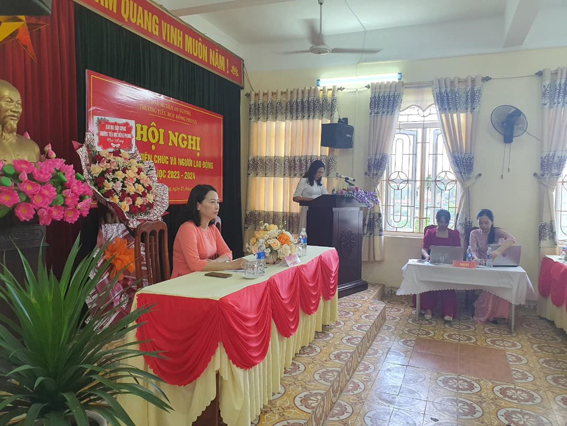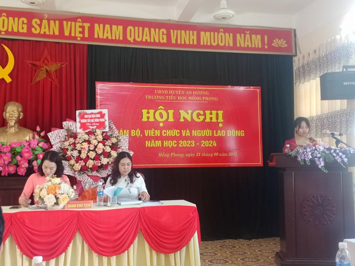 Được sự chỉ đạo của PGD&ĐT huyện An Dương, sáng ngày 21/9/2023, Trường Tiểu học Hồng Phong long trọng tổ chức Hội nghị Cán bộ, Công chức, Viên chức, NLĐ năm học 2023-2024. Về dự, chỉ đạo và biểu dương hội nghị, đại biểu PGD & ĐT có ông: Nguyễn Mạnh Hải - Phó trưởng Phòng GD&ĐT huyện, các ông/bà là cán bộ chuyên viên Phòng GD&ĐT.